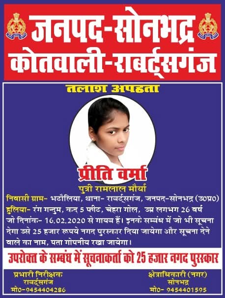 रॉबर्ट्सगंज कोतवाली क्षेत्र की एक महिला ने मिर्जापुर के चील्ह थाना क्षेत्र के हरसिंहपुर गांव निवासी वंशराम और उसके साथी वरेश कुमार उर्फ मोहन निवासी सुकृत के खिलाफ एफआईआर दर्ज कराई थी। बताया था कि उसकी 19 वर्षीय पुत्री 16 फरवरी 2020 की सुबह घर से निकली, उसके बाद से पता नहीं चला। दोनों आरोपियों पर दोस्तों के साथ गायब करने का आरोप लगाया था। पुलिस ने दोनों आरोपियों को गिरफ्तार कर लिया। अक्तूबर 2023 में दोनों के खिलाफ न्यायालय में चार्जशीट भी दाखिल कर दी गई। लेकिन युवती का पता नहीं चला। इस कारण चार्जशीट पर सुनवाई लंबित है। क्षेत्राधिकारी सीओ सिटी रणधीर मिश्रा के मुताबिक लापता युवती की तलाश जारी है। उसके बारे में सूचना देने वाले को एसपी ने 25 हजार रुपये इनाम देने की घोषणा की है। उनके या प्रभारी निरीक्षक के मोबाइल पर फोन कर सूचना दी जा सकती है। नाम-पता गोपनीय रखा जाएगा।